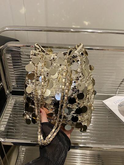 1pc Glitter Lightweight Durable Large Capacity Women's Crossbody Bag, Fashionable Versatile Party Bucket Bag Suitable For Party, Travel, Evening - Gold - View 9
