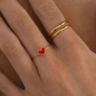 1pc Gold & Red Stainless Steel Heart Shaped Ring, Material, Eternal Classic Element, High Quality Minimalist Style For Daily Wear - Gold - View 1
