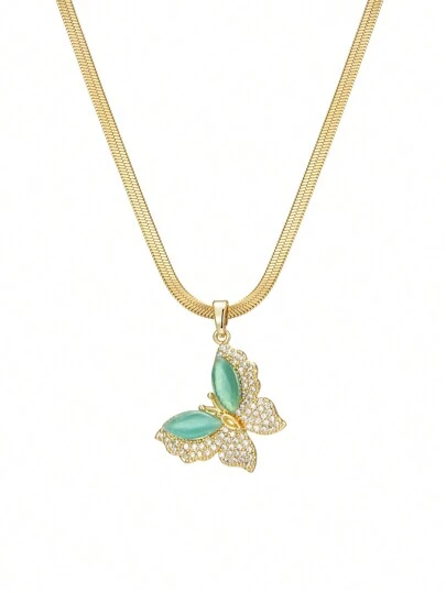 1pc Gold Tone Stainless Steel Flat Chain Necklace, Inlaid With Diamonds & White Cat Eye Butterfly Pendant, Fashionable & Simple, Versatile For Both Men & Women, Perfect For Costume Party, Halloween, Christmas, Or Everyday Wear - Mint Green - View 1