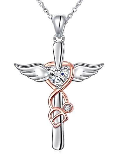 1pc Gothic Style Angel Wing & Stethoscope Pendant Necklace With Artificial Crystal Cross, Gift For Nurses And Doctors - Silver - View 1
