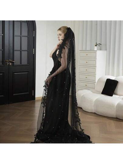 1pc Gothic Vintage Style Lace Trim Faux Pearl Long Veil, Suitable For Halloween Costume, Photoshoot - Black - View 1