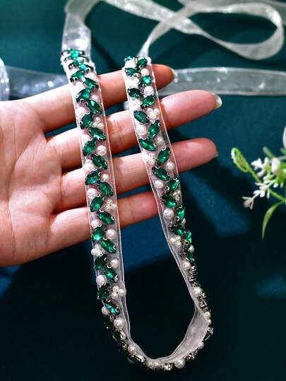 1pc Green Rhinestone Bridal Sash, Evening Gown Waist Decor, Bridesmaid Belt, Wedding Dress Accessory - Ivory Organza - View 1