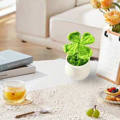 1pc Handmade Woven Artificial Flower Pot Statue, Lucky Four-Leaf Clover Potted Decor Figurine, Desktop Small Ornament Party Favor, Ideal For St. Patrick's Day Decoration - Multicolor - View 1