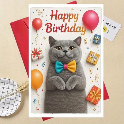 Thiệp chúc mừng sinh nhật, hình chú mèo xám dễ thương đeo nơ và cầm bóng bay, hộp quà trang trí đẹp mắt, kèm phong bì, món quà sinh nhật hoàn hảo cho người yêu mèo.