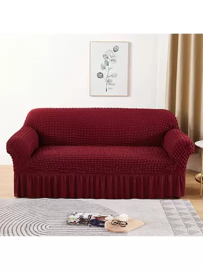 1pc High Elasticity Bubble Chiffon Sofa Cover With Skirt Style, Four Seasons General Bubble Grid Sofa Cover, Pet-Proof, Easy To Install Sofa Protector - Burgundy - View 1