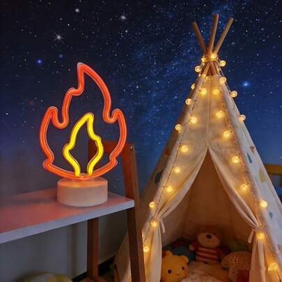 1pc LED Flame Shaped Neon Light Desk Decor, Battery/USB Powered Romantic Fairy Lamp, Birthday Theme Atmosphere Light, Children Gift, Home Decor, Bedroom, Party - Base Flame Neon Light - View 1