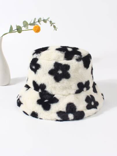 1pc Ladies' Black Plush Flower Decor Bucket Hat For Everyday Wear, Autumn And Winter Leopard Print - Black - View 1