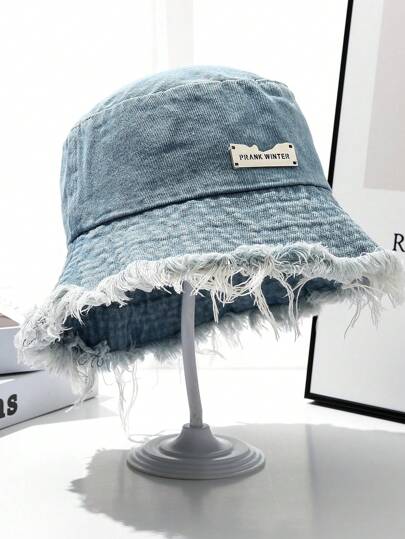 1pc Ladies' Fringed Washed Denim Bucket Hat, Suitable For Daily Life, Greatly Matches Clothes Street - Baby Blue - View 1