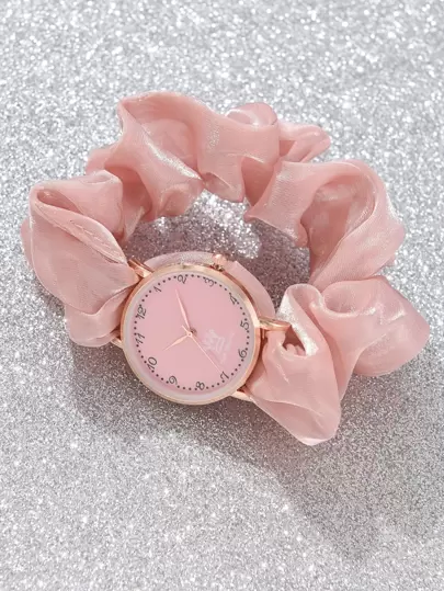 1pc Ladies Watch Round Pointer Scrunchie Quartz Watch Pink Strap Digital Crown Scale A Gift For A Friend - Pink - View 1