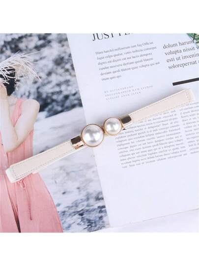 1pc Lady's White Elastic Skinny Belt With Pearl Buckle, Suitable For Casual Wear With Dress, Shirt - White - View 1