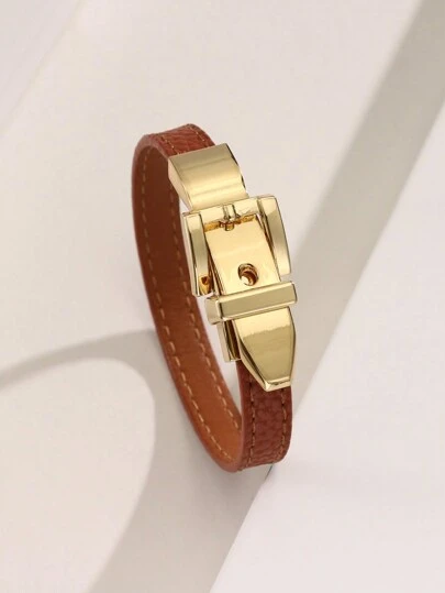 1pc Leather Bracelet With Buckle Closure, Minimalist Decorative Wristband, Adjustable Accessory, Fashionable For Daily Wear, High-Quality Christmas Gift, Essential For Trendsetters - Coffee Brown - View 1