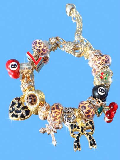 1pc Leopard Print Bow Heart Charm Bracelet, 1pc Cute Red Cherry Bracelet, 1pc Lucky Number 777 Bracelet, 1pc Birthstone Bracelet, 1pc Cute Bow Bracelet, 1pc Fashionable Leopard Print Music Festival Heart Bracelet - Gold - View 1