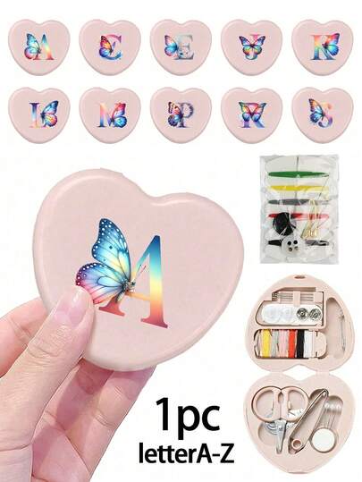 1pc Love Shaped Sewing Toolbox With Colorful Butterfly Letters A-Z, The Perfect Gift For Beginners In Sewing:Portable Mini Sewing Set - Foldable, DIY Sewing Supplies And Accessories, Suitable For Travelers And Emergency Clothing Fixators, Mini Needle Box, Portable Small Needle Bag Sewing Tool Combination Set, Hotel Supplies (Pink) - Multicolor - View 1
