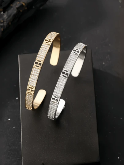 1pc Luxury Sparkling Zirconia Hollow Geometric Letter Minimalist Open Bangle Bracelet, Versatile For Daily, Party, Wedding, Summer, Suitable As Eid/Eid Al-Fitr Gift - Bracelet - View 1