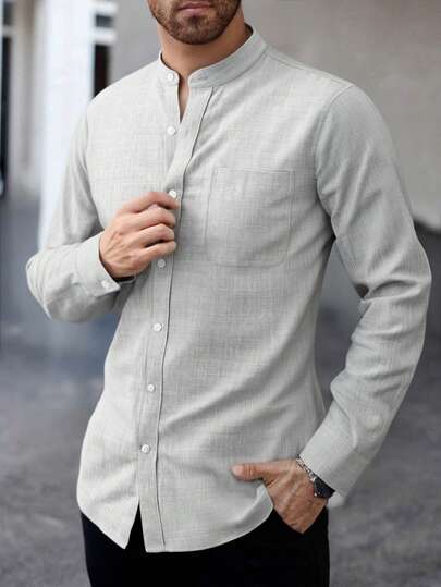 1pc Men's Light Gray Stand Collar Long Sleeve Shirt, Business Casual Versatile Top, Slim Fit Wrinkle-Resistant Easy Care - Light Grey - View 1