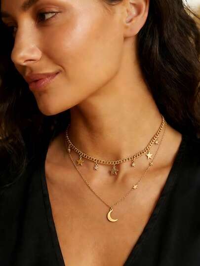 1pc New Creative Minimalist Star & Moon Crescent Tassel Necklace - Yellow Gold - View 3