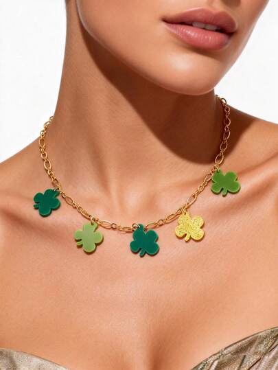 1pc New Minimalist Multi-Pendant St. Patrick's Day Gift Necklace, Creative Pendant Choker Necklace, Spring/Summer - Green - View 1