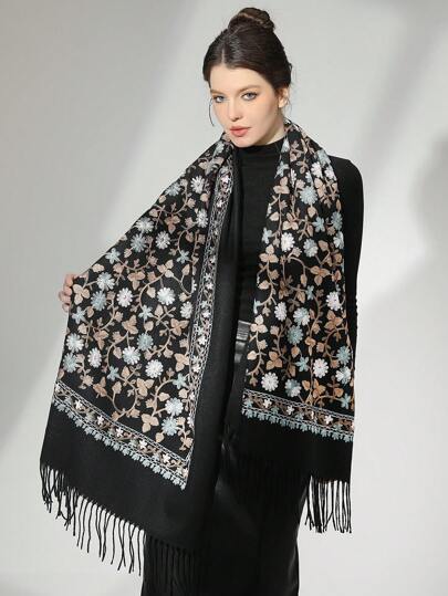 1pc New Thick Hand-Embroidered Flower Faux Cashmere Shawl, Warm, Casual, Travel, Gift, Fashionable Decorative Scarf - Black - View 1