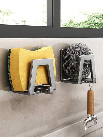1pc No Drilling Stainless Steel Tube Sponge Storage Shelf For Kitchen - Multi-Functional Pot Cover Organizer With Steel Wire Ball & Pot Brush Hook - Multicolor - View 2