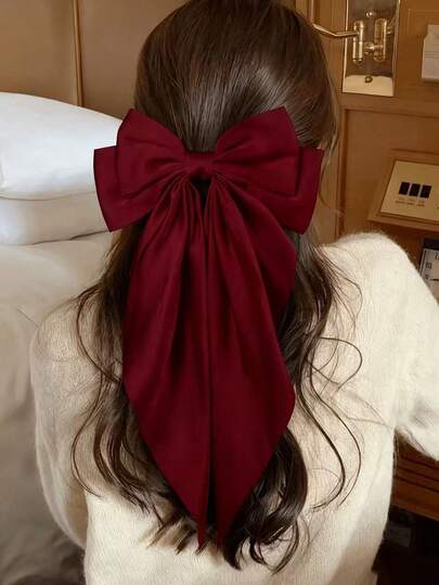 1pc Oversized Burgundy Satin Bow Hair Clip, Cute & Elegant Hair Accessory, Neutral Blue Metal Bowknot Hair Clip, Suitable For Back To School And Summer Beach Vacation, Hair Accessories For Women, Head Accessories - Burgundy - View 1