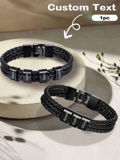 1pc Personalized Engraved Name Bracelet, Custom Leather Bracelet, Personalized Bracelets, Ideal Gift For Women Wife Mom, Custom Name Engraved Braided Leather Bracelets Christmas Birthday Gifts For Grandma Girlfriend, School Supplies, Back To School, For Office, For University, For Colleague, For Dorm Rooms, For Teacher, For Boys And Girls, For Teenagers, College Students, University Students, Freshman, Sophomore, Underclassmen, Customized Fashion Engraved Bracelets, Look Glamour, Jewelry & Watches, Season Picks, Elegant Outfit - Black - View 1