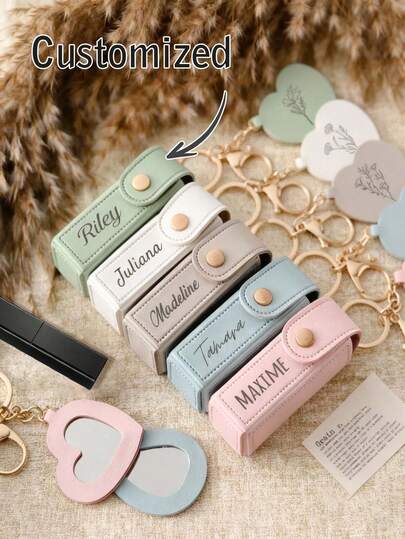 1pc Personalized Lipstick Keychain With Mirror, Customizable Name Lipstick Pouch, Bridesmaid Gift, Valentine's Day Gift - Multicolor - View 1