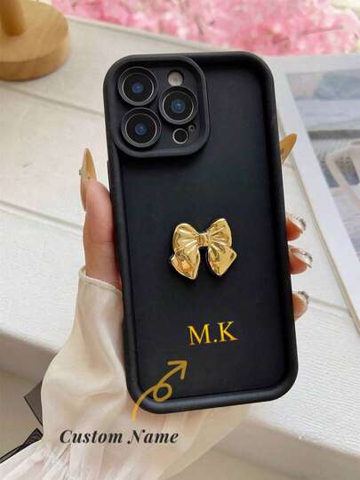 1pc Personalized Metal Bow Matte Full Coverage Shockproof Candy Color Phone Case, Customizable Letter Name, Retro Solid Color Couple Phone Case, Compatible With Apple 17 16 15 14 Pro Max 13 12 11 Plus, Valentine's Day Gift, Good Birthday Gift, Holiday Gift, Gift For Her, Personalized Gift, Etsy/ Customized Product, Customized Gift For Her, Anniversary Gift, Wedding Gift, Personalized Gift For Mom (Foil Stamping) - Black - View 1