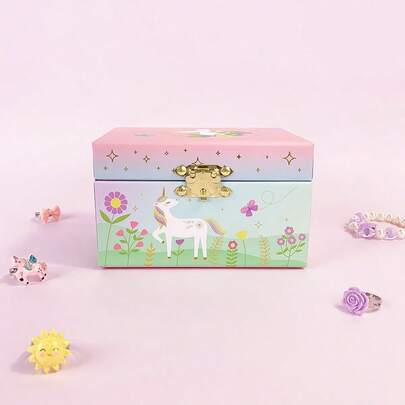 1pc Pink & Green Unicorn Mini Rectangular Music Box, Paper Material, Can Store Lipstick, Jewelry, Toys, Pocket Size, Knob Operated, Built-In Mirror, Decorative For Living Room, Bedroom, Desk, Suitable For Valentine's Day, Birthday, Wedding, Daily Use - Multicolor - View 1