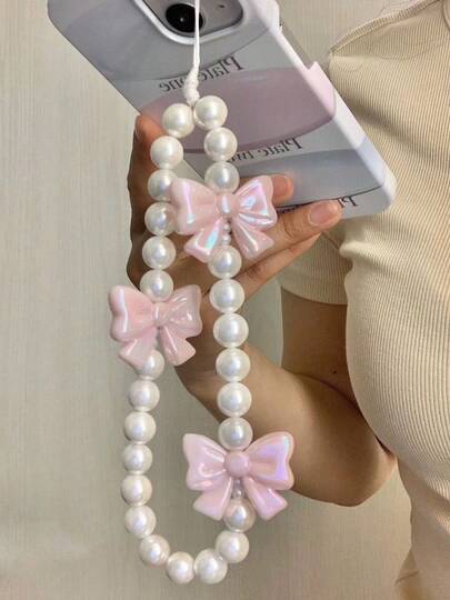 1pc Pink Phone Case Accessory Bowknot Acrylic Faux Pearl Phone Lanyard, Suitable As Gift For Mother, Family, Friends, Birthday, Festival - Phone Charm, Phone Strap - Pink - View 6