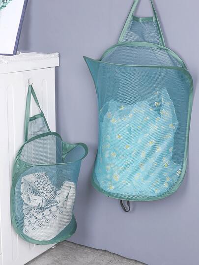 1pc Plain Mesh Wall Hanging Laundry Hamper - Green - View 7
