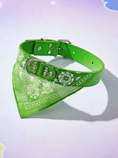 1pc Printed Pet Collar With Adjustable Bandana And Leash Hook For Outdoor Activities - Green - View 1