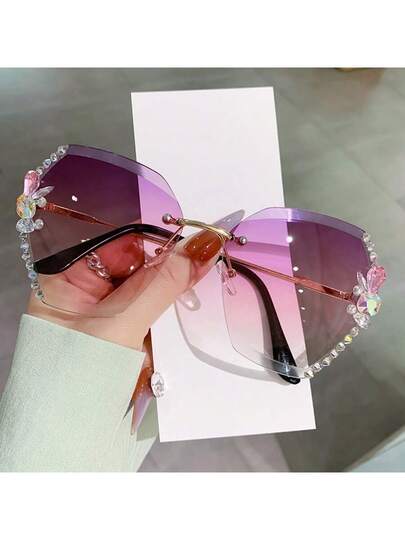 1pc Rhinestone Decorative Fashion Glasses For Women, Fashionable Y2K Style, Slimming, Versatile Preppy Style For Back To School Butterfly Shape Rhinestone Decor - Purple Yellow - View 1