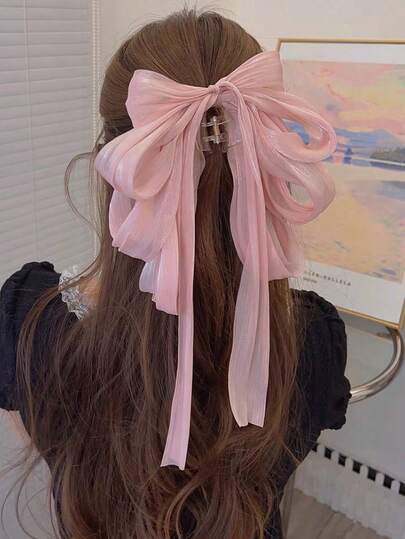 1pc Rhinestone Ribbon Bow Decor Decorative Hair Claw, Sweet And Exaggerated For Holiday And Vacation Summer Claw Clips Hair Clips Hair Jaw Clip Hair Clamps Hair Clutch Hair Catcher Clip, Casual Fall Winter Hair Accessories For Women - Pink - View 1