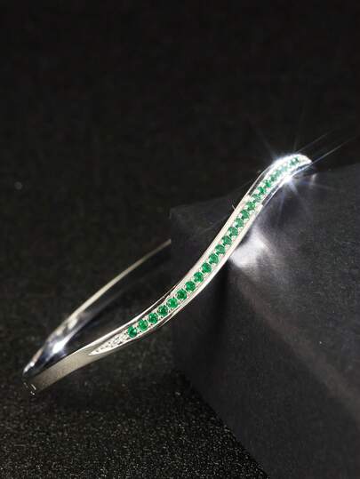 1pc S925 Silver Bracelet With Emerald Green Hue, Embedded With Lab-Grown Gemstones, Elegant Curved Design, Suitable For Spring Tea Parties, A Thoughtful Mother's Day Gift Showcasing Warmth And Refinement - Silver - View 1
