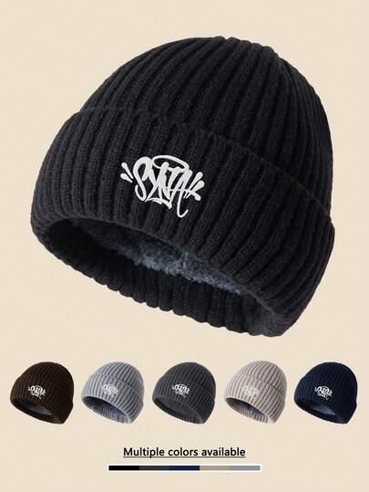 1pc SYNA Embroidered Knit Beanie Hat, Thermal Lined, Windproof & Warm, Soft & Comfortable, Simple & Fashionable, Essential Winter Hat - B - View 11