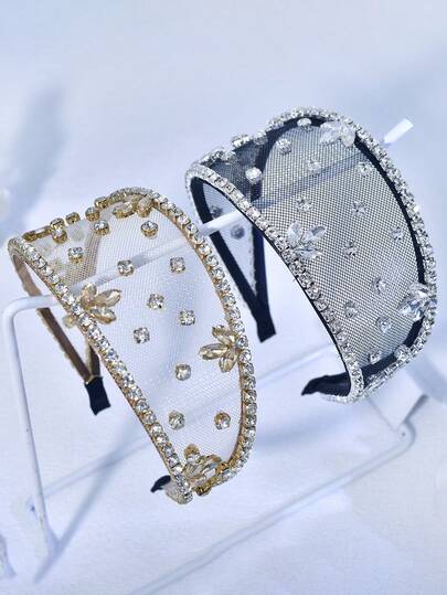 1pc Shiny Crystal Flower Wide Headband, Fashionable Baroque Style Mesh Hollow Minimalist Headband, Suitable For Bride, Wedding, Festival, Carnival Party, Daily Casual Wear - Multicolor - View 1