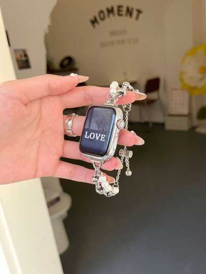 1pc Pearl Bracelet Stainless Steel Watch Band Compatible With Apple Watch 46/38/40/41/42/44/45/49mm, Compatible With Apple Watch S10/9/Ultra/SE/8/7/6/5/4/3/2/1 - Silver - View 1