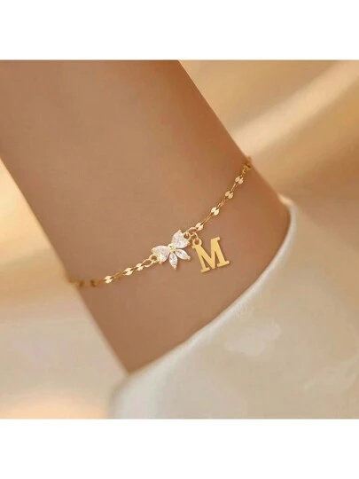 1pc Simple Fashion Crystal BowKnot Initial Stainless Steel Gold Color Lip Chain Bracelet For Women - Style 2 - View 1
