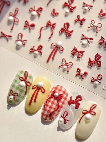 1pc Simple Line Bow Nail Art Decal, Red And Black Hot Stamped 3D Self-Adhesive Nail Stickers, Faux Pearl Rhinestone Nail Stickers, DIY Nail Art. - Multicolor - View 1