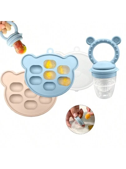 1pc Smile Chew Toy With 1pc Silicone Baby Food Container With Lid, Fruit & Vegetable Feeding Set Includes Teether, Feeding Tools And Baby Chew Stick - Multicolor - View 1