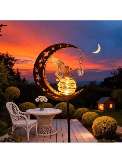1pc Solar Powered Fairy Kicking Moon Iron Art Garden Light, Warm LED Light For Yard, Lawn, Park - Fairy Kick - View 1