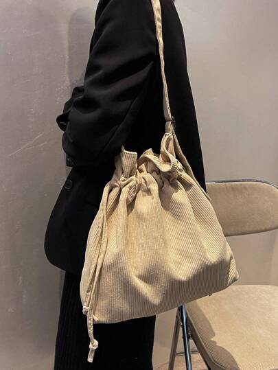 1pc Solid Color Drawstring Detail Women's Shoulder Bag - Beige - View 1