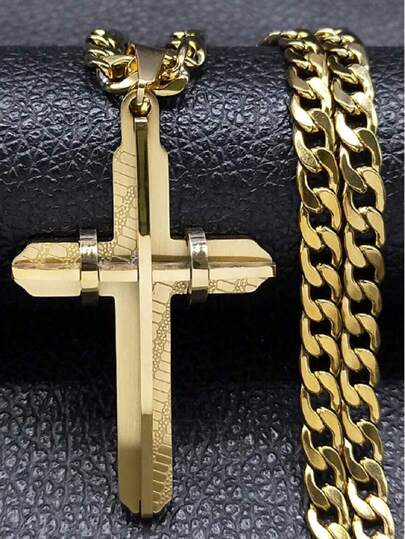 1pc Stainless Steel Cross Pendant Necklace, Suitable For Men's Everyday Wear, Perfect Gift For Father's Day, Family & Friends - Gold - View 1