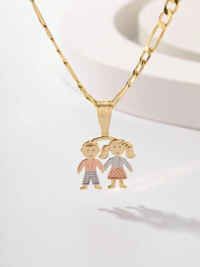 1pc Stylish And Simple Tri-Color Copper Plated Carved 3d Boy & Girl Holding Hands Pendant Necklace, Suitable For Gift Giving, Couples, Friends, Daily Wear And Festivals - Yellow Gold - View 1