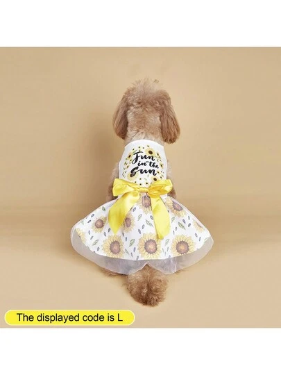1pc Sunflower Print Dog/Cat Dress With Waist Bow Decor, Suitable For Small/Medium Pets, Lightweight Summer Pet Clothing - Yellow - View 1