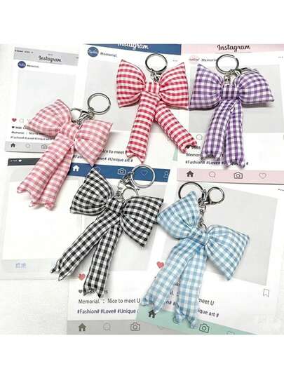 1pc Sweet Girls Heart Plaid Bow Keychain Bag Charm, Cute Backpack Purse Pendant Perfect For Back To School & Daily Use - Multicolor - View 1