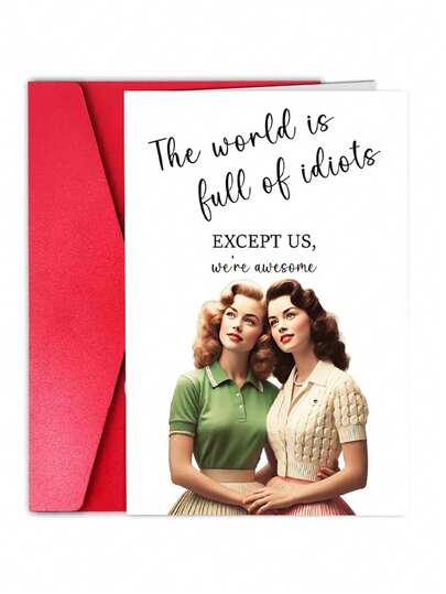 1pc The World Is Full Of Idiots Except Us Greeting Card - Funny Happy Birthday For Women Her Sister - Humorous Thinking Of You Birthday Gift Idea - Bday Card For Bestie Best Friend Blone Brunette - 18*13cm - View 3