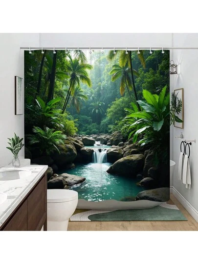 1pc Tropical Waterfall Shower Curtain, Featuring A Cascading Waterfall Flowing Over Moss-Covered Rocks, Surrounded By Palm Trees And Greenery, Creating A Jungle Bathroom Decor Ambiance. Waterproof And Mildew-Resistant, Machine Washable, Made Of Polyester, Non-Opaque, Lightweight And Breathable. Color May Vary Slightly Due To Lighting Conditions. Includes 12 Hooks - Artistic Bathroom Decor. - Multicolor - View 1
