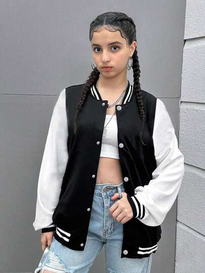 1pc Tween Girl Casual Loose Colorblock Outdoor Sports Fleece Bomber Jacket, Thick & Warm For Spring, Autumn & Winter - Black - View 1