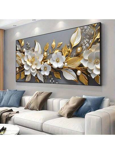 1pc Unframed Modern Canvas Art Painting, Featuring White Flowers And Golden Leaves, Suitable For Decorating Living Room And Bedroom - Gold - View 1